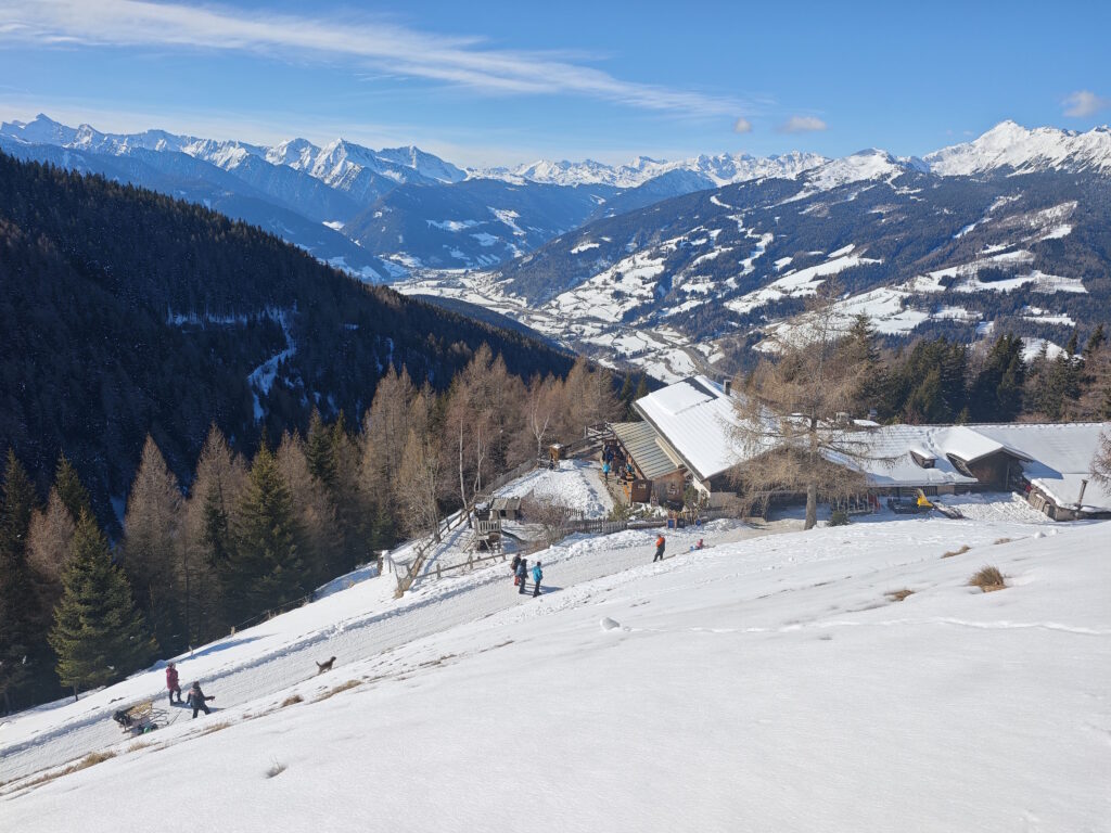 Die Prantneralm ist über die Grenzen des Tals hinaus für ihre Gastfreundschaft und die hohe Qualität der Küche bekannt. Nach dem Aufstieg kannst du dich mit Südtiroler Klassikern wie Speckknödeln, Schlutzkrapfen oder hausgemachten Mehlspeisen stärken. Ein großer Pluspunkt für Tagestouristen: Du musst keinen eigenen Schlitten den Berg hochziehen. Auf der Alm gibt es einen Rodelverleih und einen Helmverleih. Das Praktische daran ist das „Einweg-System“: Du leihst die Rodel und Helme oben aus und gibst sie nach der Abfahrt einfach unten am Parkplatz wieder ab.