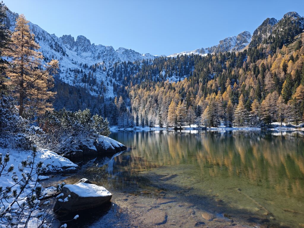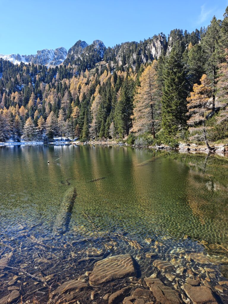 Im unteren Abschnitt ist der Wald teilweise ausgelichtet, sodass du immer wieder weite Blicke ins Tal und in die Sarntaler Berge werfen kannst. Weiter oben wird der Wald dichter. Bis auf eine kleine Almwiese im mittleren Teil und die Puntleider Seealm, wanderst du fast die ganze Zeit im Wald. Vom Zwischenziel Puntleider Seealm sind es etwa 20 Minuten bis an den See. Kurz bevor du dein Ziel erreichst, lichtet sich das Gelände und der Blick öffnet sich auf den stillen, klaren Puntleider See. Rund um das Ufer wachsen Lärchen und Zirben. Außerdem wachsen ganz viele Almrosen rund um das Ufer – im Juni sicher ein Augenschmaus, wenn die Almrosen blühen. Wir sind im Spätherbst hier und die Lärchen brennen förmlich – goldgelb glänzen sie in der Sonne. Eine ganz besondere Atmosphäre!