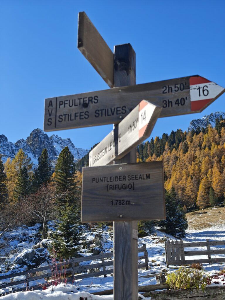 Von Sterzing aus fährst du entlang der Brenner Bundesstraße nach Süden Richtung Franzensfeste (Fortezza) oder Brixen. Nach ca. 12 Kilometern zweigt man bei Grasstein (Le Cave) ins Puntleidtal ab. Eine schmale Bergstraße führt hier in mehreren Kehren steil hinauf zu den Puntleider Höfen, dem Ausgangspunkt der Wanderung. Beim letzten Hof befindet sich ein kleiner Parkplatz direkt an der Straße, der sich ideal als Startpunkt eignet. In der darunter liegenden Straßenkehre (ca. 800 Meter entfernt) gibt es noch weitere Parkmöglichkeiten, wenn der obere Platz bereits belegt ist.